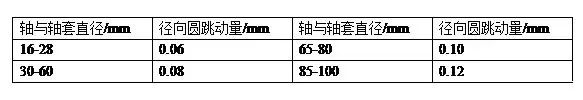 答:1)检查轴(或轴套)的配合尺寸、表面粗糙度、倒角、轴的轴向窜动量及径向跳动等,对有轴套的,要检查轴与轴套的配合间隙。安装机械密封轴径(或轴套)的表面粗糙度应为1.6以下,轴的轴向窜量不得大于0.25mm。轴套不得轴向轴向窜动,允许轴或轴套的径向圆跳动量,如图: